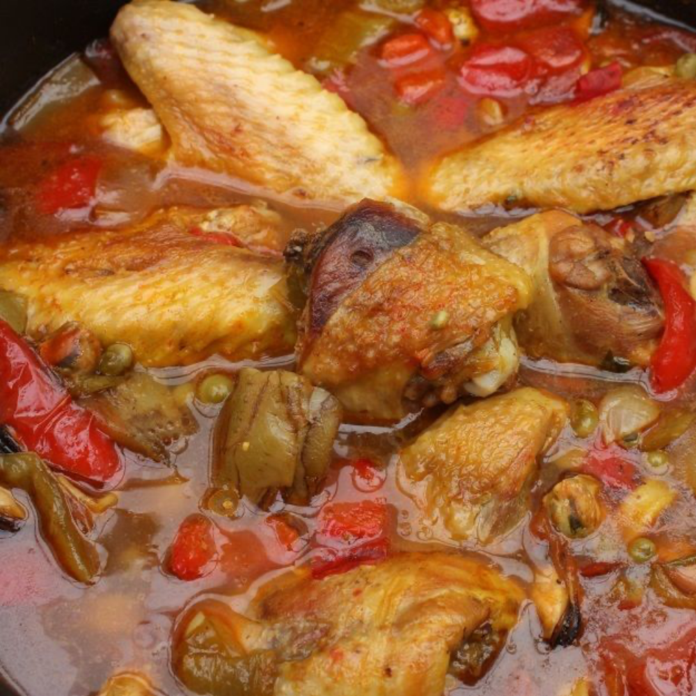 Une cuisse de poulet poêlée, mijotée dans un coulis de tomate parfumé de thym et de laurier, accompagnée de poivrons rouges et verts, le tout rehaussé d'une pointe de piment d'Espelette.
