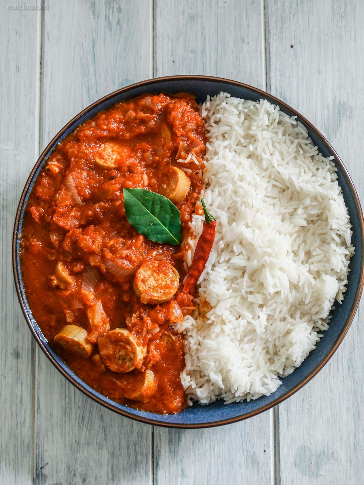 Un rougail saucisse savoureux accompagné de riz, pour un repas complet et plein de goût.