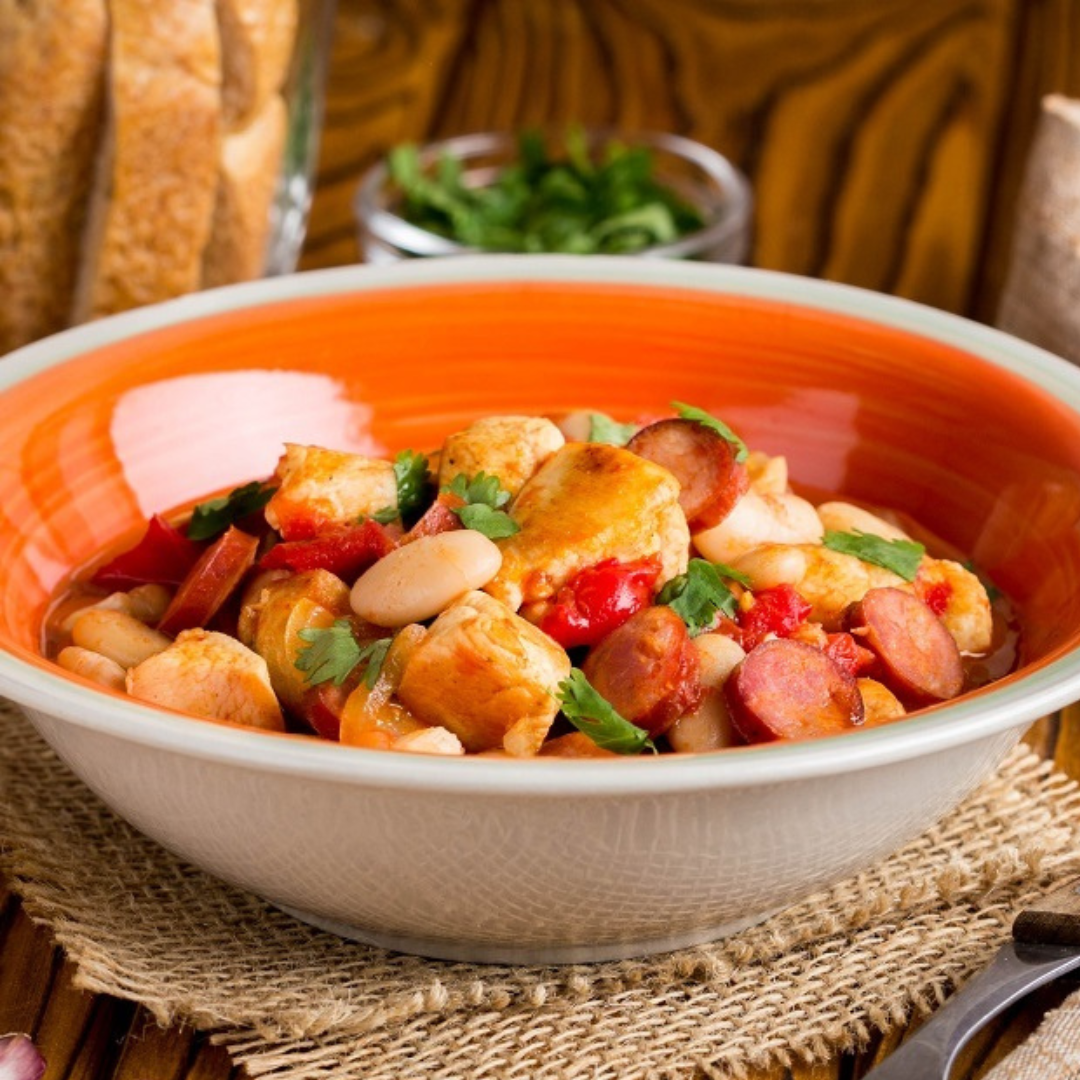 Des saucisses sautées au massalé et mijotées dans un coulis de tomate parfumé de thym et de laurier, accompagnée de poivrons rouges et verts.